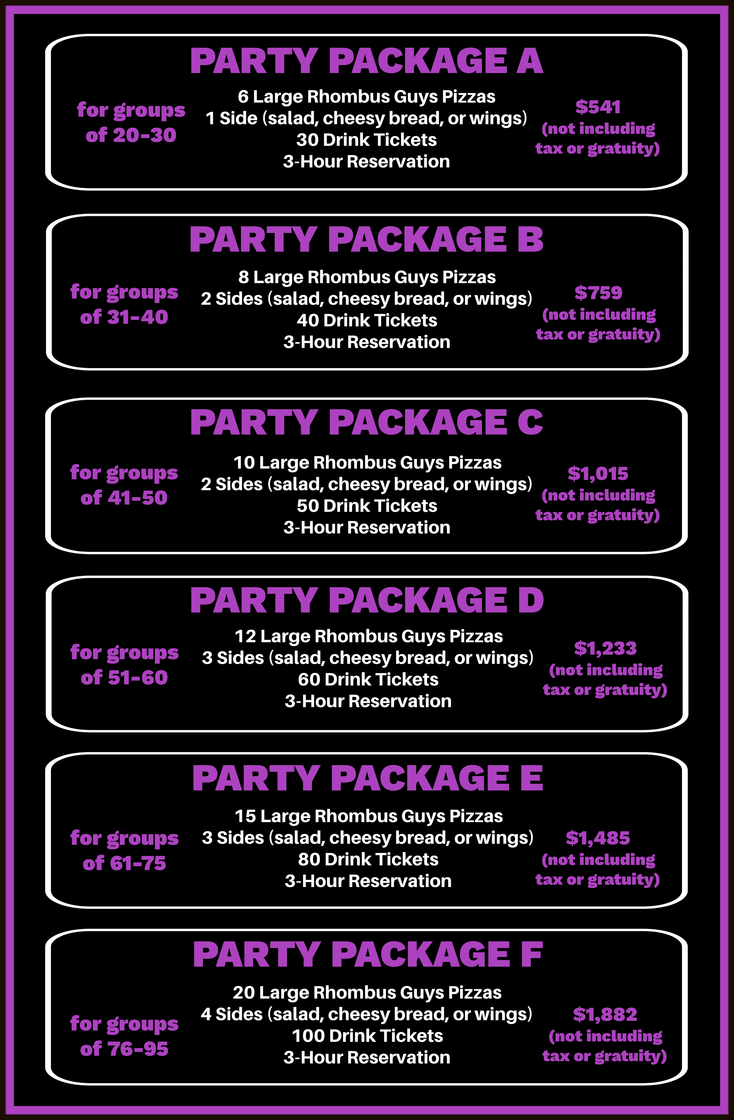 There will be tax & an automatic 20% gratuity charge on all Party Packages orders.